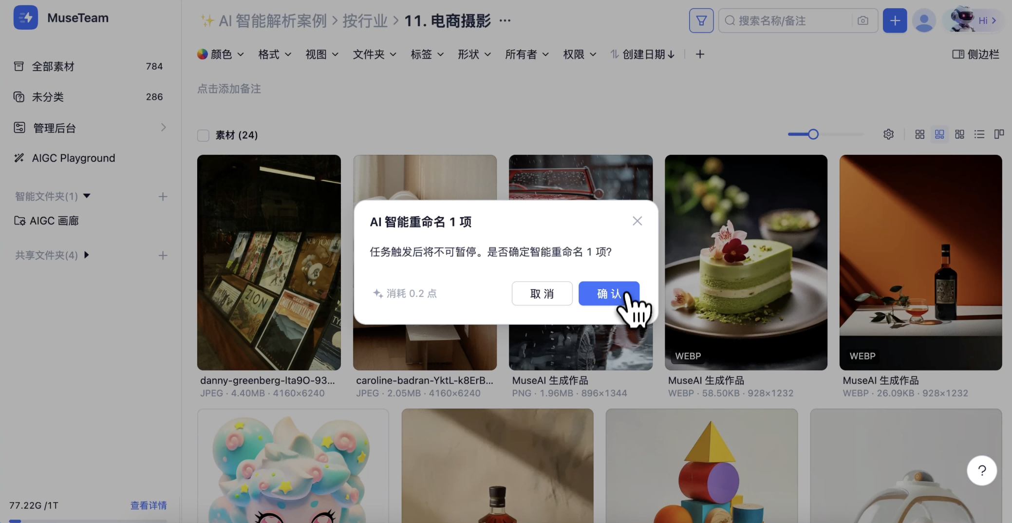💬 AI 智能重命名Written by MuseDAMUpdated on March 25, 2026🎯 功能概述AI 智能重命名 是 MuseDAM 基于 AI 解析能力的智能命名功能,系统会自动分析素材内容,为文件生成准确、有意义的文件名,彻底解决文件名乱码、无意义编码等问题。适用场景