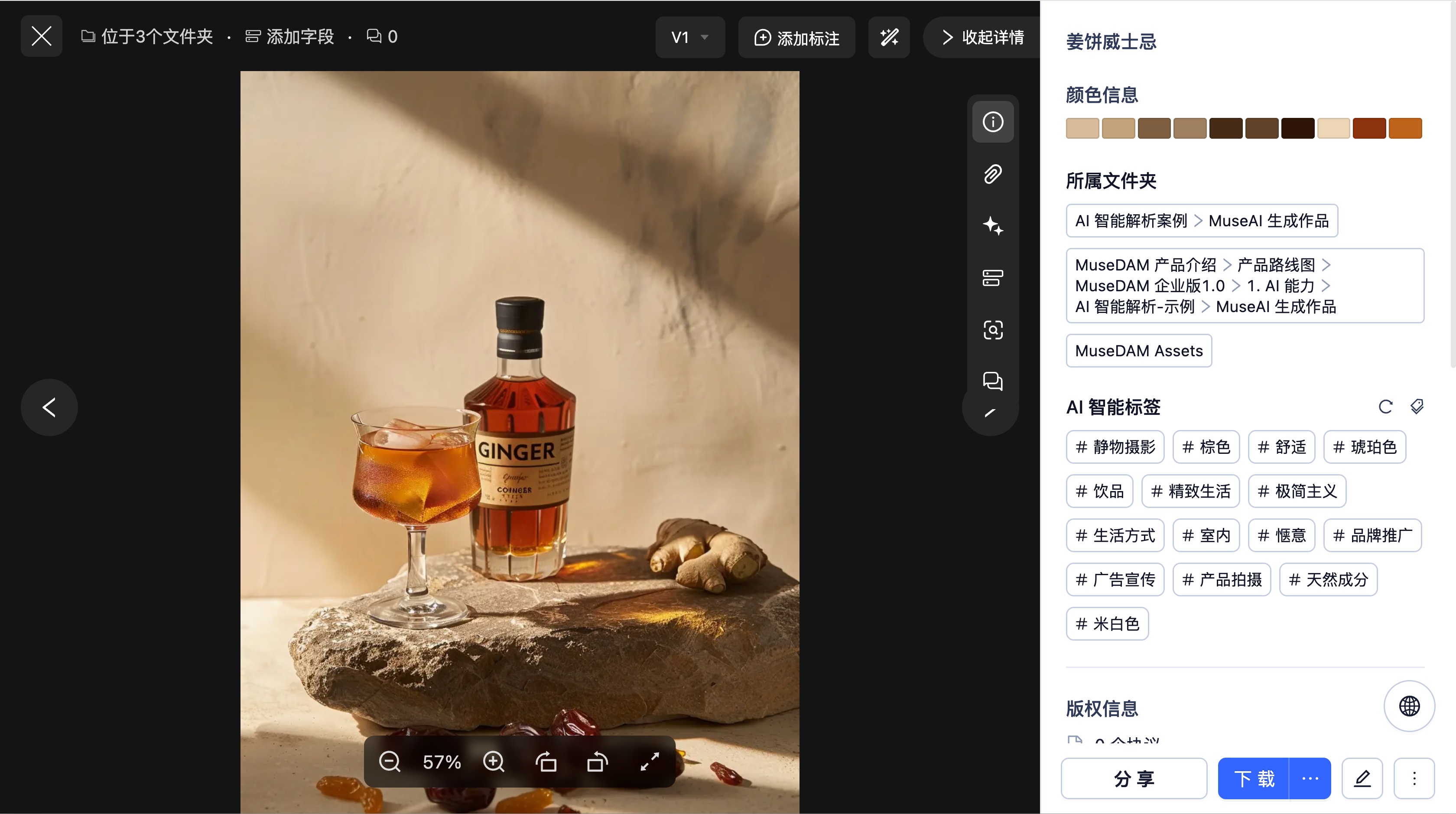 AI 智能标签 是 MuseDAM 的核心 AI 能力之一,素材上传后系统自动识别图像内容,从颜色、风格、场景、情绪、物品类别等维度生成一组描述性标签,直接添加在素材详情页上。生成的标签即时可用于全局搜索,帮助企业快速定位所需素材。标签支持手动增删,也可随时触发刷新重新生成。