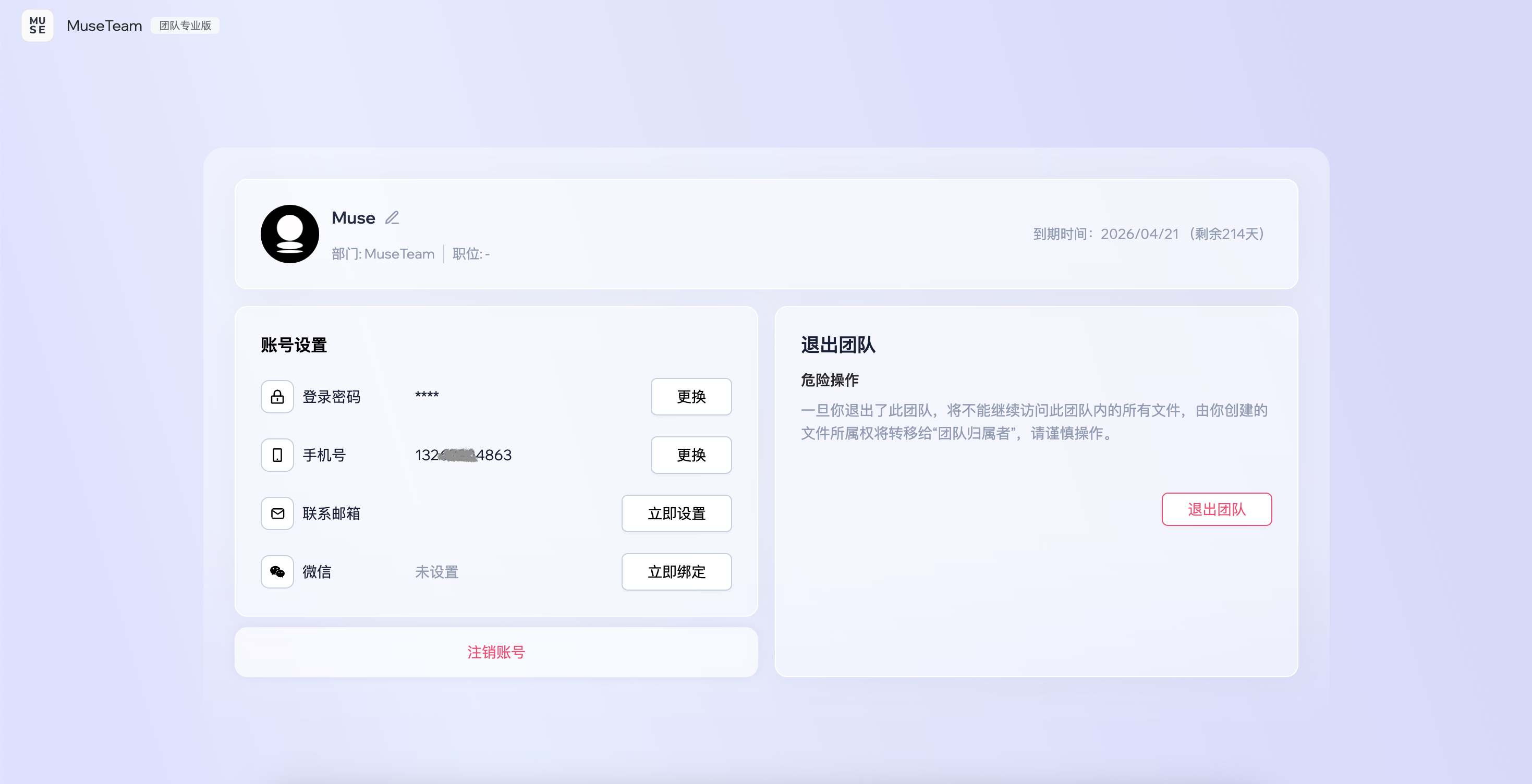 账号设置中提供退出团队功能,让用户可以安全地离开当前工作空间。团队归属者删除整个空间,普通成员可自行退出团队。退出团队则会使成员失去对该团队空间内所有文件的访问权限,且由其创建的文件所有权将自动转移给「团队归属者」。两种操作均不可撤销,请谨慎操作。