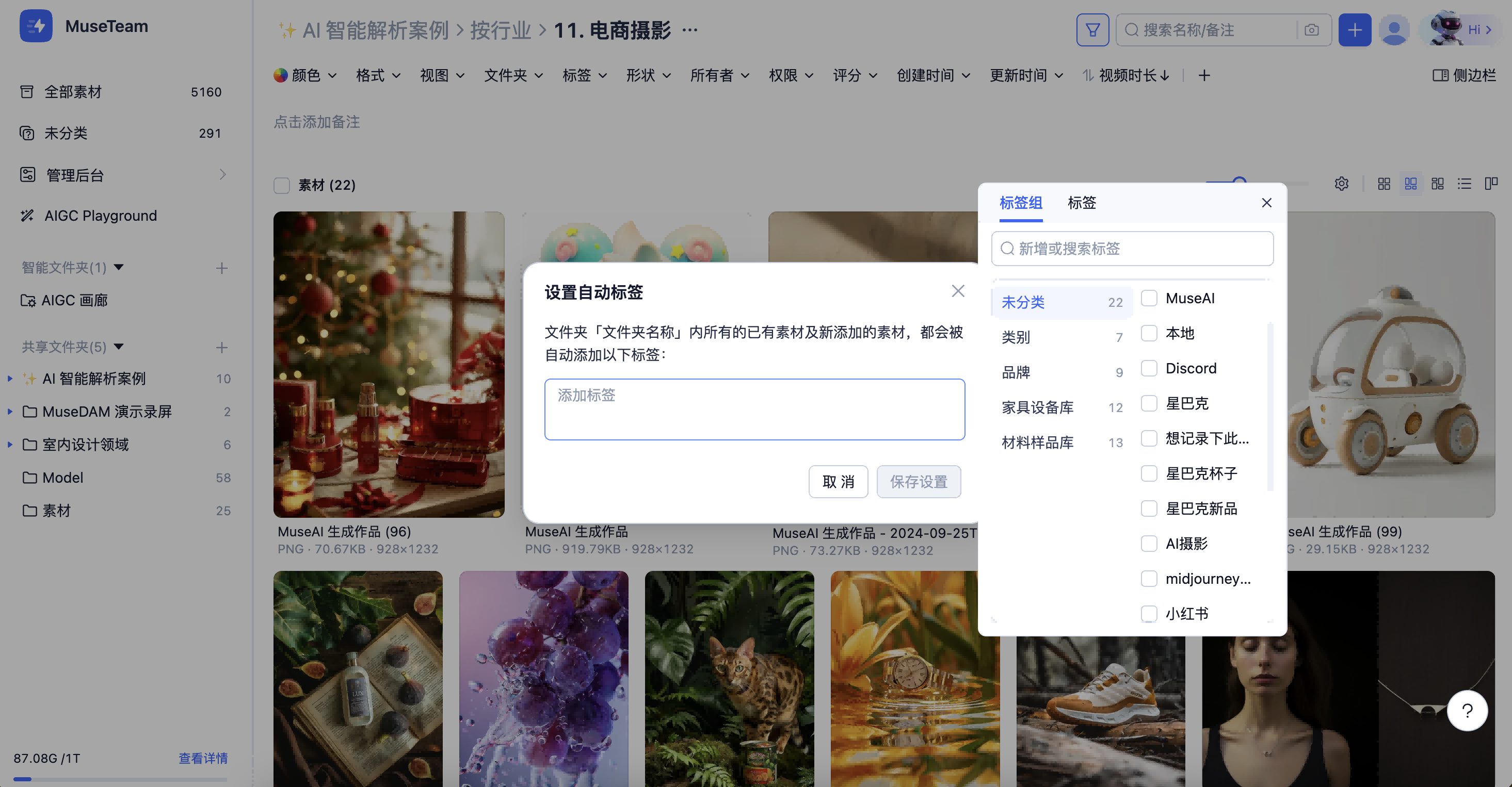 批量自动标签 允许用户为指定文件夹设置自动标签,设置后系统将对该文件夹内所有已有素材和后续新上传的素材统一添加所选标签,实现整个文件夹维度的批量打标。