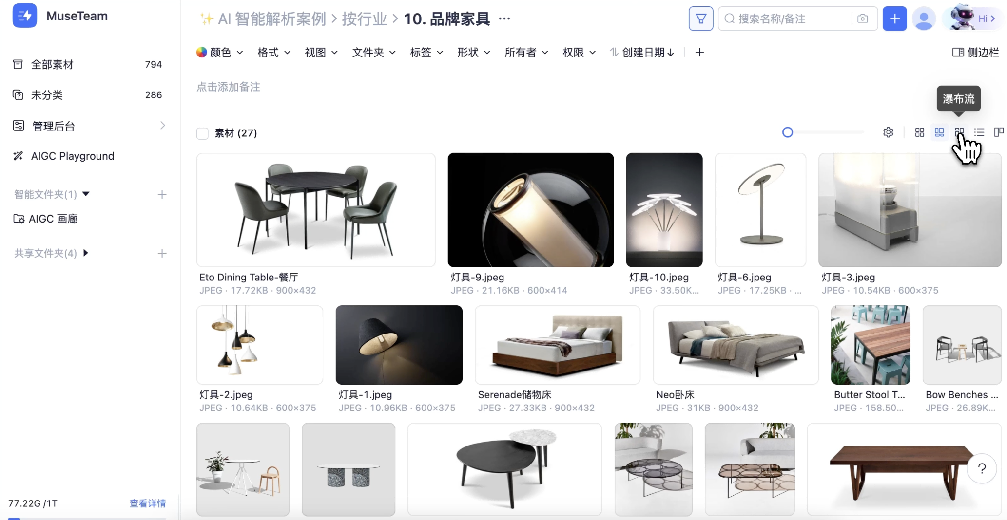 MuseDAM 提供五种内容视图模式:网格、自适应、瀑布流、列表、看板,可根据不同工作场景自由切换。每种视图针对不同的浏览和管理需求进行优化,让素材内容呈现更直观、工作流程更高效。