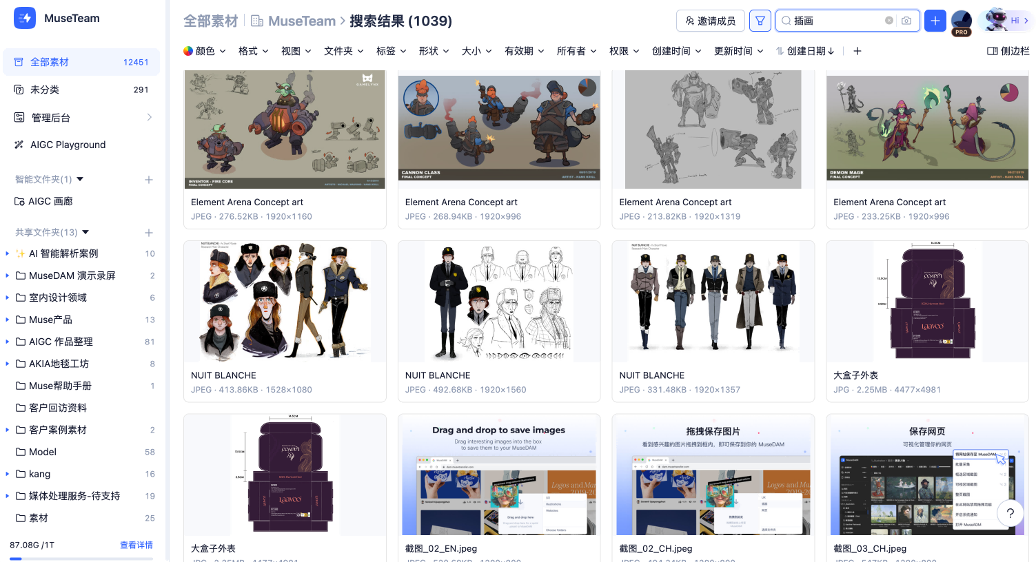 关键词检索 是 MuseDAM 核心的素材定位方式。在顶部搜索框中输入关键词后,系统会同时在素材名称、AI 智能解析内容、标签(包括 AI 智能标签与人工标签)以及备注四个维度中进行全面匹配,返回所有相关素材。