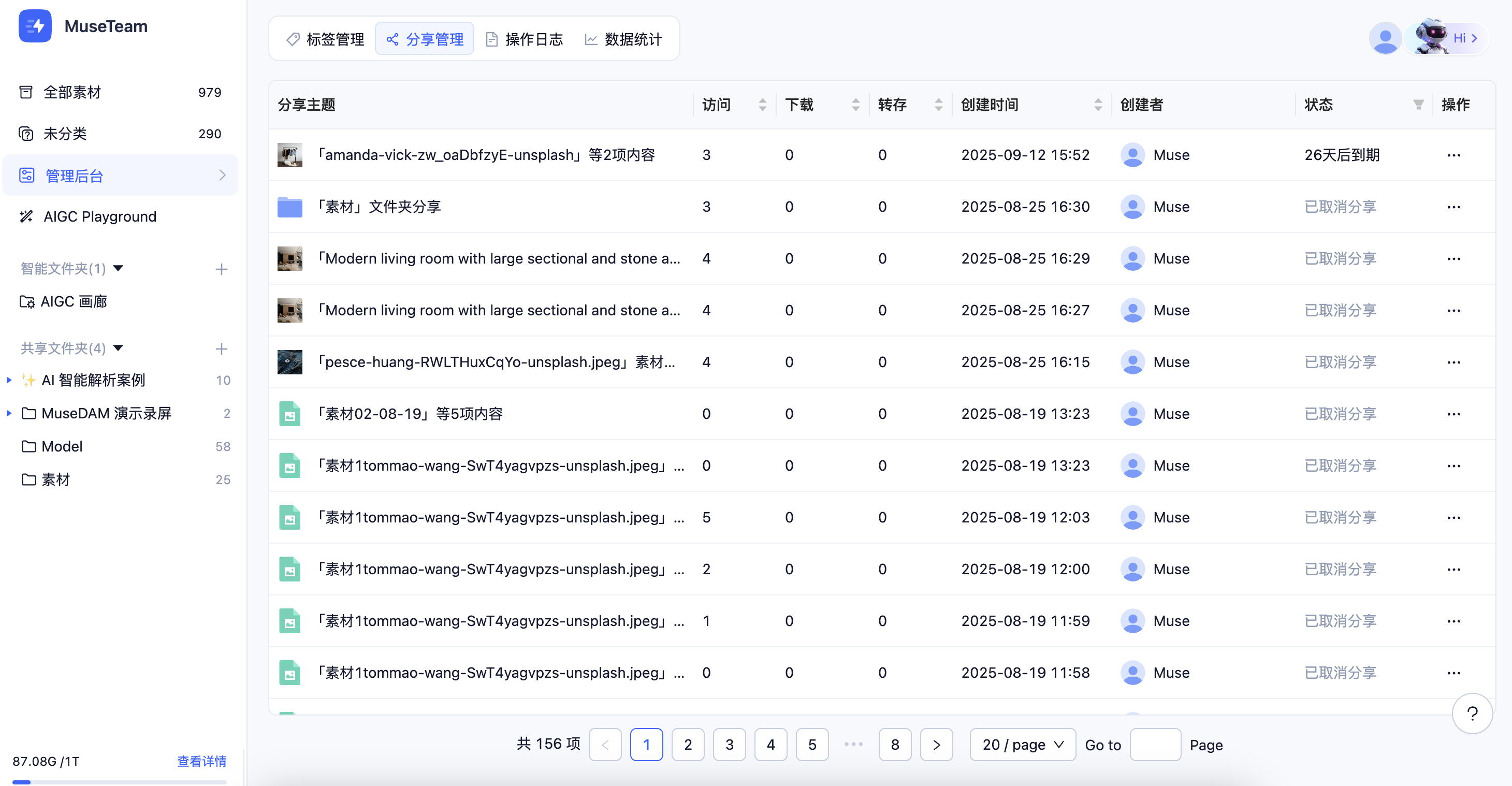 点击左侧「管理后台」,选择「分享管理」,系统将显示所有分享链接的统一管理界面