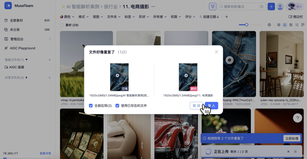 MuseDAM 提供智能查重检测功能,在上传素材时自动识别重复内容,帮助团队避免资产冗余,保持资产库的整洁性和存储效率。