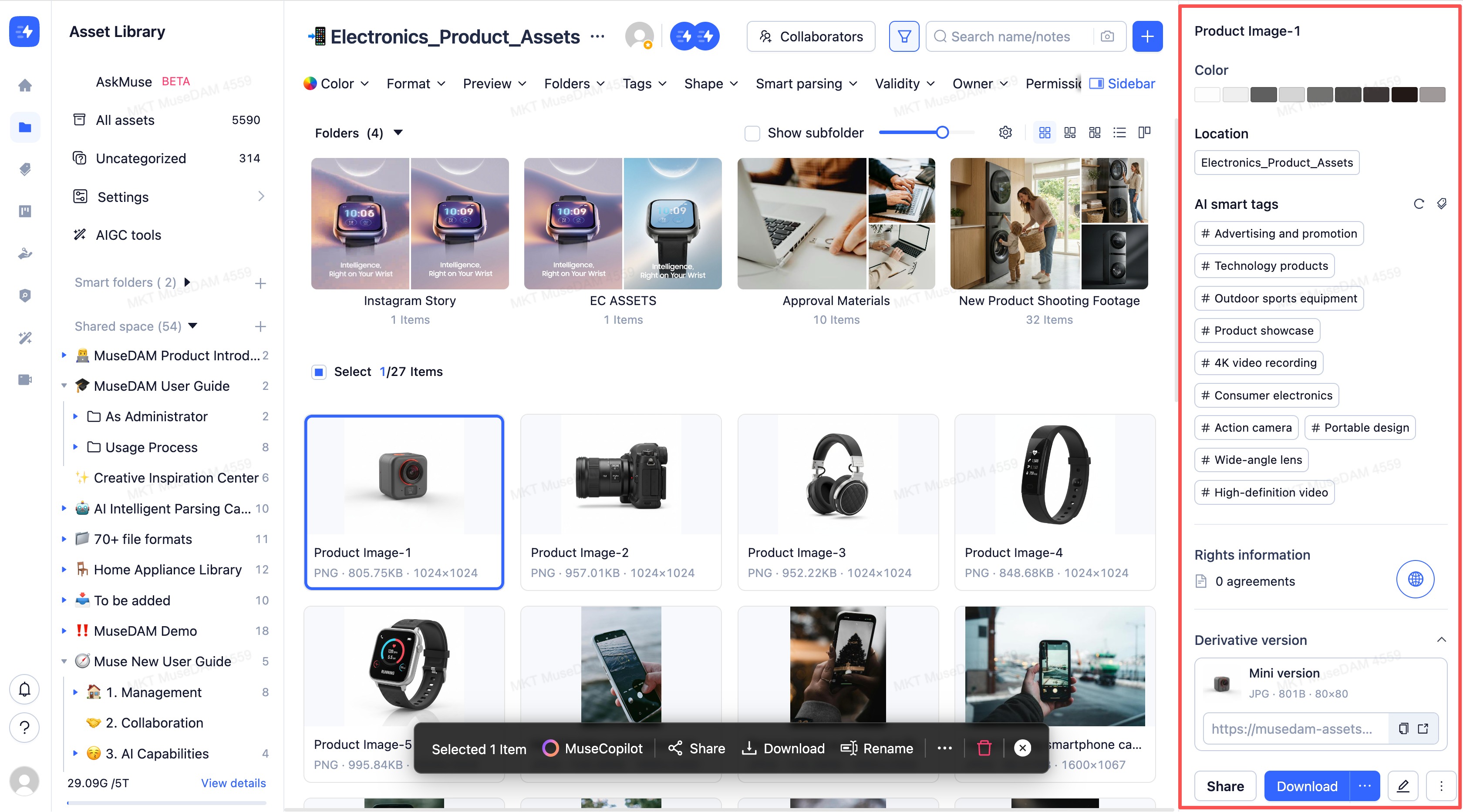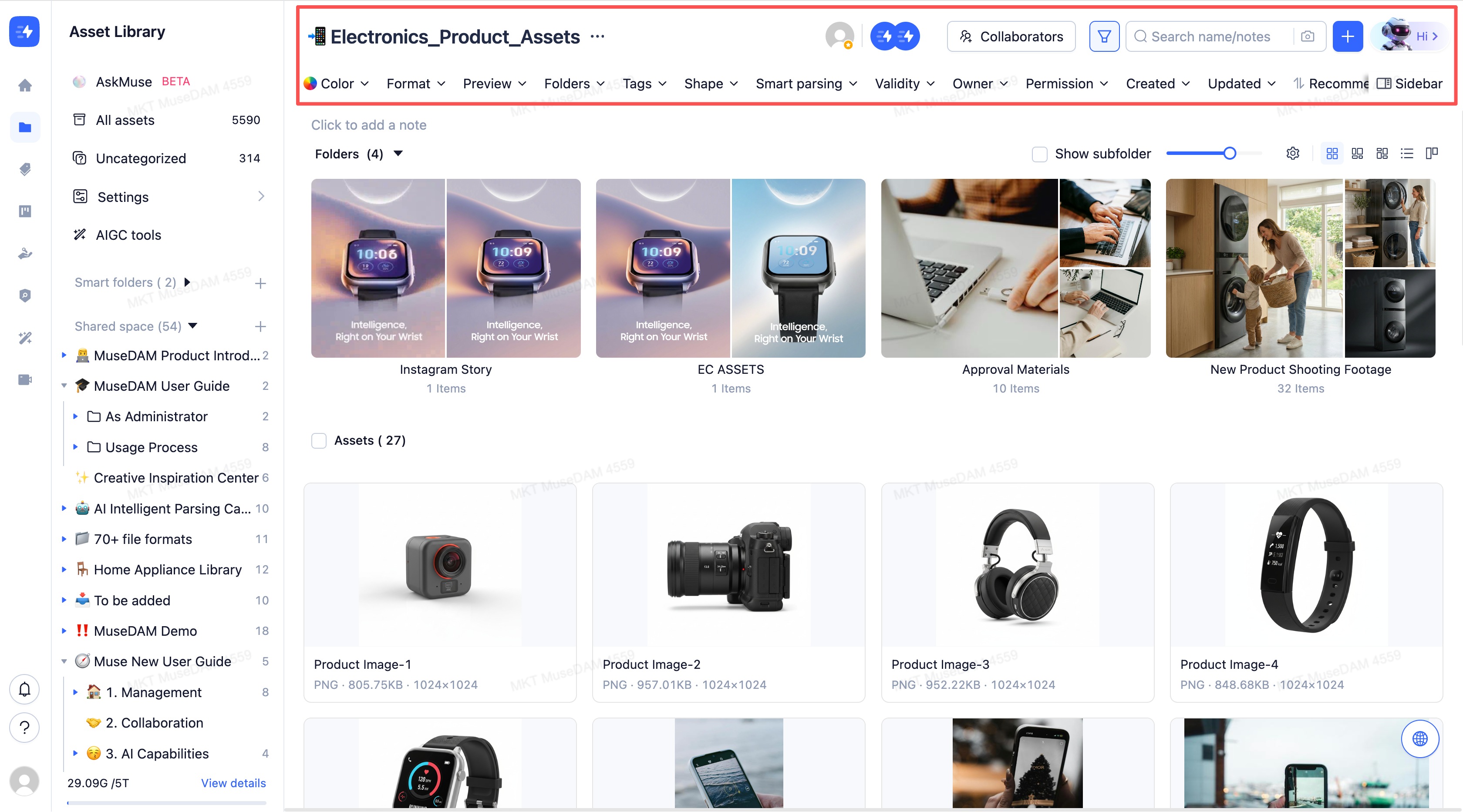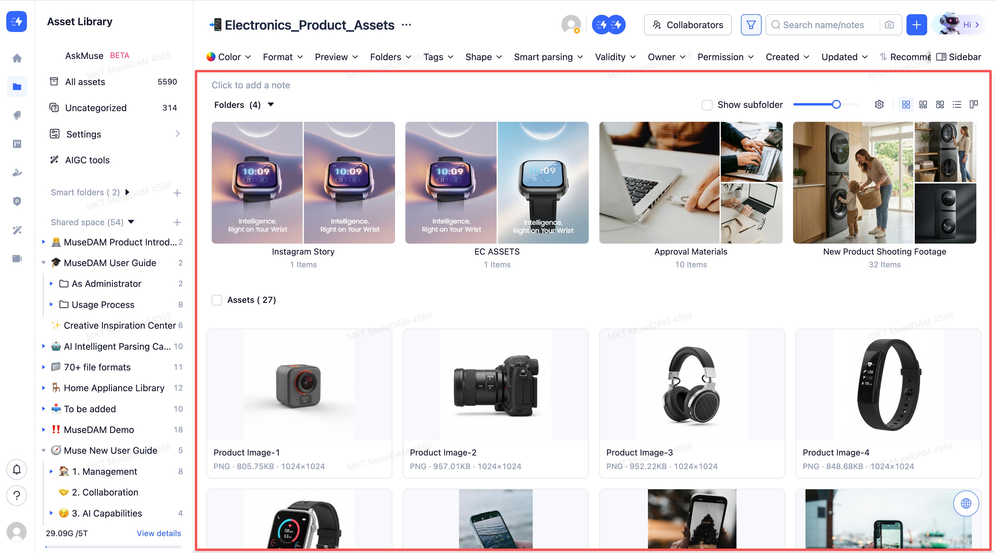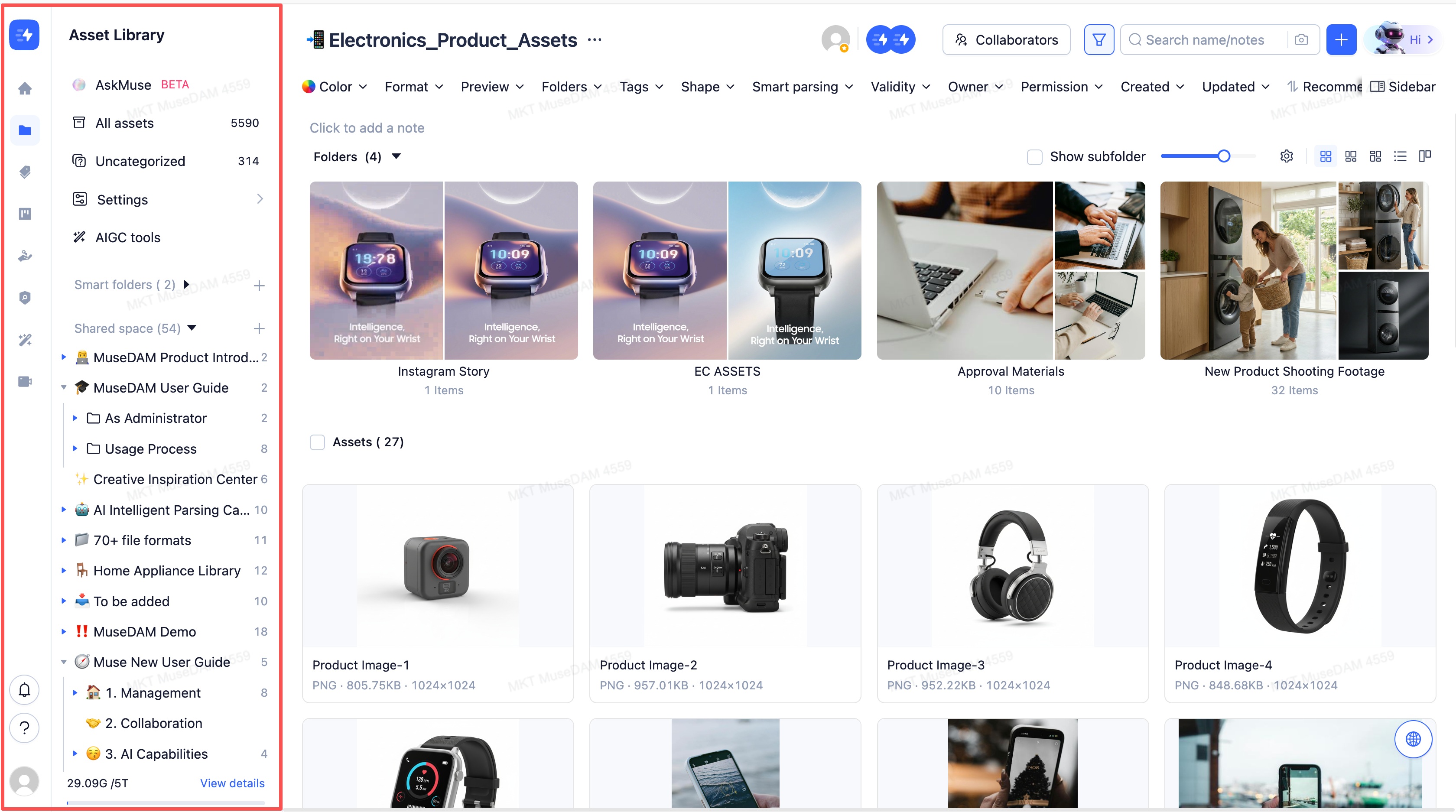 MuseDAM uses a modern three-panel layout designed to make digital asset management intuitive and efficient. The interface is organized into three core areas — a left navigation panel, a top toolbar, and a main content area — giving you everything you need to browse, search, manage, and act on your assets without friction.