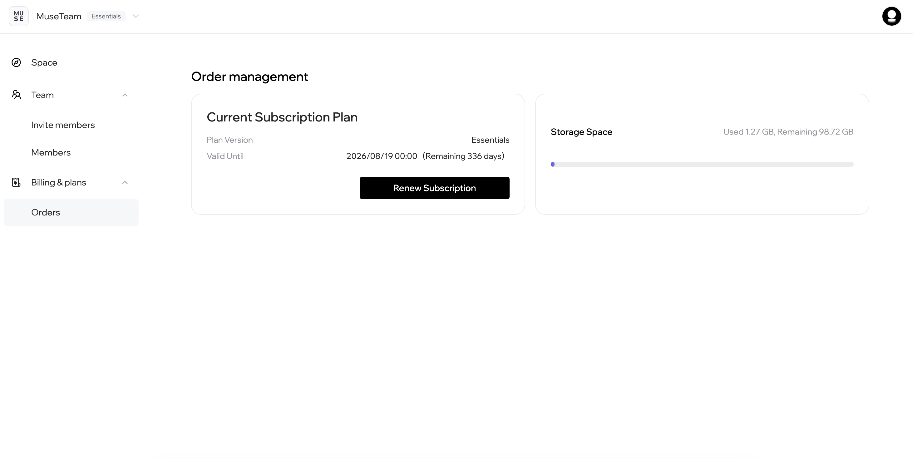 Subscription Management gives team admins a clear, centralized view of their current plan status, resource usage, and renewal options. From a single interface, you can monitor storage consumption and AI credits in real time, review your subscription history, and renew your plan before it expires — keeping your workspace running without interruption.